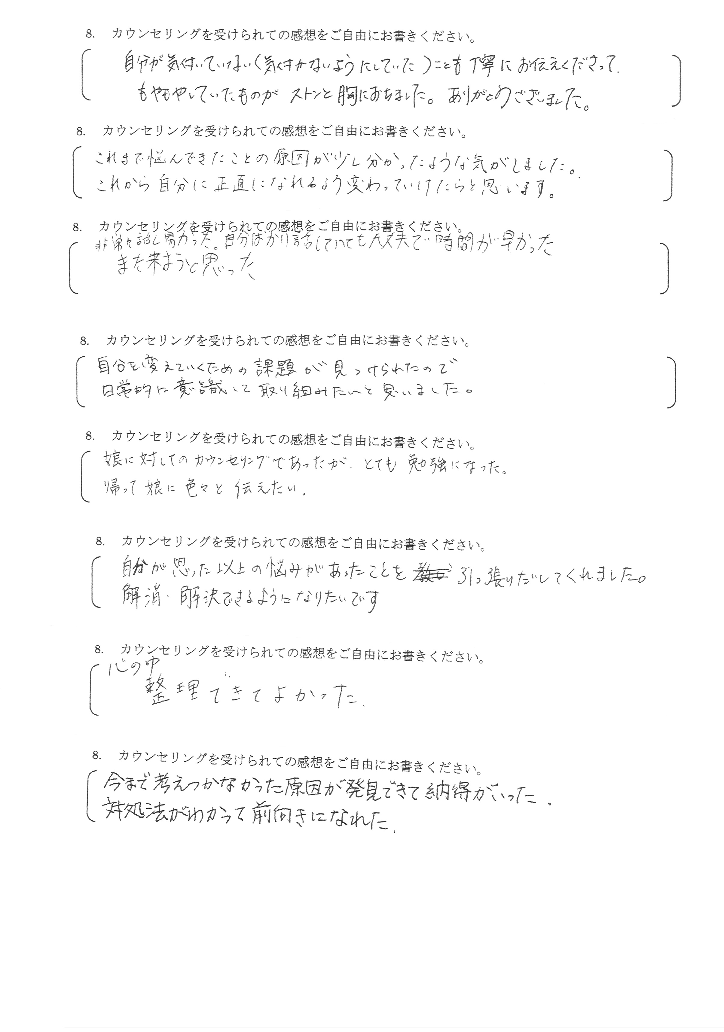 カウンセリングを受けた皆様から頂いたご意見やご感想をまとめました。これからカウンセリングを受けてみようとお考えの皆様には、他の方のご意見を参考にしていただけると幸いです。